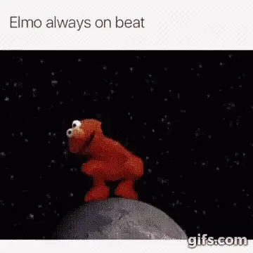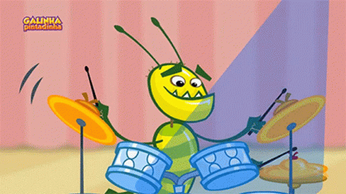 An animated insect from Galinha Pintadinha enthusiastically playing drums in a band setting.