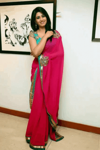 A woman elegantly poses in traditional Bathukamma Telugu marriage attire, showcasing vibrant sarees and lehengas.