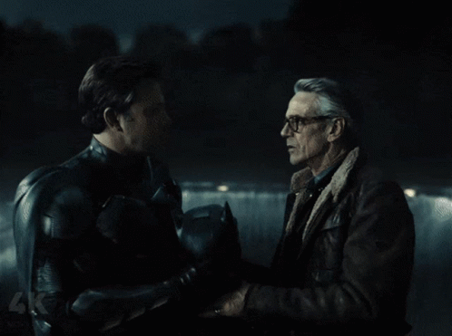 Batman and Alfred discuss faith before Batman boards a large, dark vehicle marked 'jCU'.