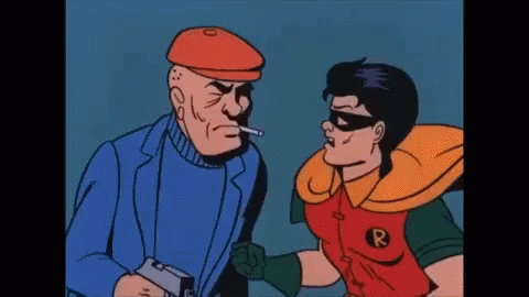Batman and Robin engage in a classic cartoon fight, featuring iconic sound effects like 'POW' and 'ZCK!'