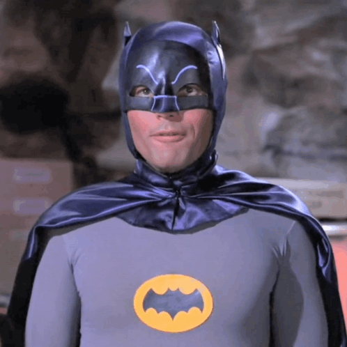 Adam West as Batman from the classic 1960s TV series, wearing his iconic grey suit and cowl.