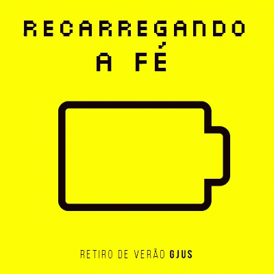 An animated battery icon charging on a yellow background, with the text 'Recarregando a Fé' (Recharging Faith) and 'Retiro de Verão GJUS' (GJUS Summer Retreat).