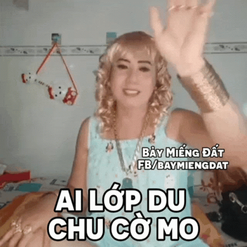 Minh from Bay Mieng Dat, wearing a blonde wig, waves and says "I love you" and "bye bye."