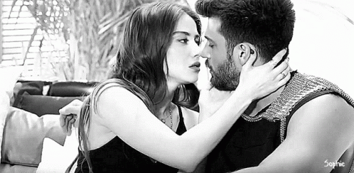 Can Yaman and Özge Gürel share an intense, almost-kiss moment in a black and white scene from Bay Yanlış.
