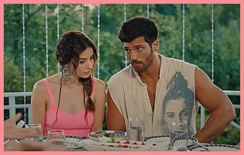 Can Yaman and Ozge Gurel from Bay Yanliss are sitting at a table, looking intently at something during a dinner scene.