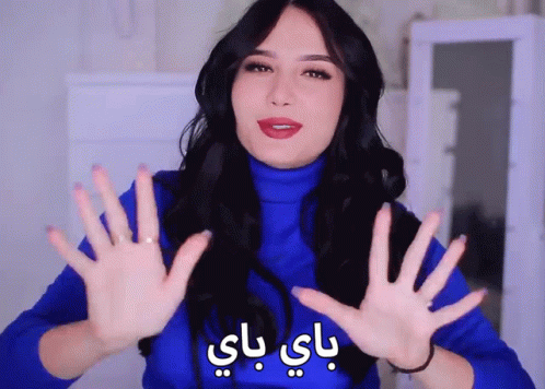 Yosr waves goodbye to the camera, wearing a blue turtleneck and red lipstick.