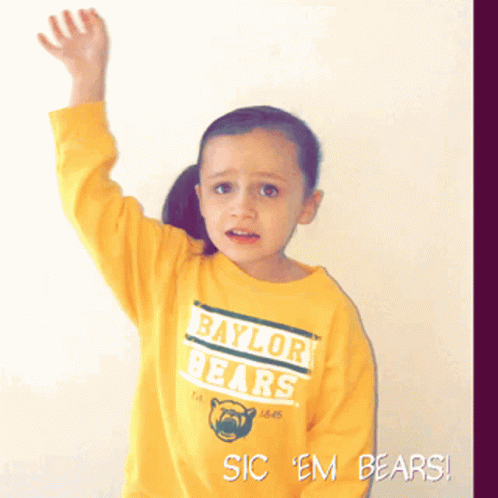 A little girl in a Baylor Bears shirt enthusiastically performs the 'Sic 'Em Bears' cheer.