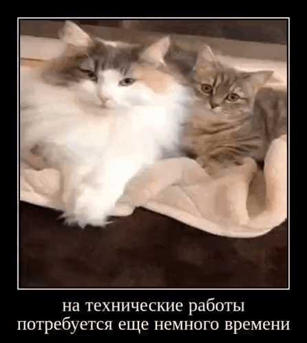 Two cats, a fluffy white one and a tabby kitten, resting together with a Russian meme caption about technical work.