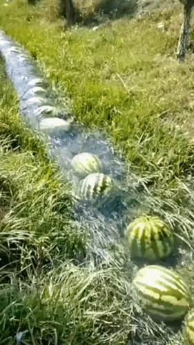 Watermelons floating down a narrow water channel for transport or harvesting in an agricultural setting.