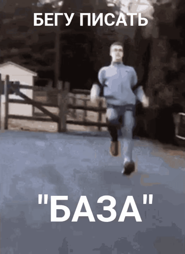 A man appears to float-run on a road with Russian text 'RUNNING TO WRITE' and 'BASE' on screen.