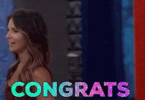 An excited woman celebrates with a big smile, as 'CONGRATS' sparkles on screen, likely from Big Brother 20.