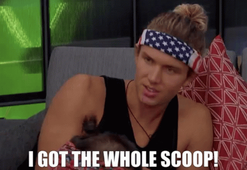 Tyler Crispen from BB20, wearing an American flag headband, confidently declares, "I got the whole scoop!"