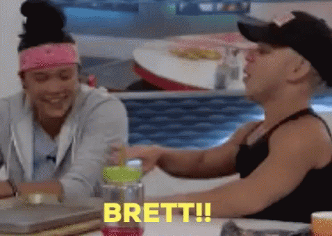 A man and woman at a table, with the man reacting as 'BRETT!!' appears on screen in a BBJC moment.