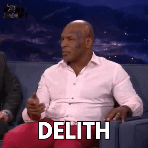 Mike Tyson reacts while sitting on a couch with the word 'DELITH' displayed.