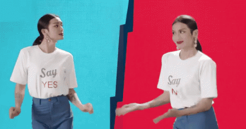 Bb Trần dancing in a split screen, wearing 'Say YES' and 'Say NO' shirts, representing choices.