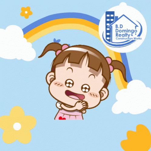 A cute cartoon girl expresses 'I Love It!' with hearts, set against a rainbow background, featuring B.D Domingo Realty.