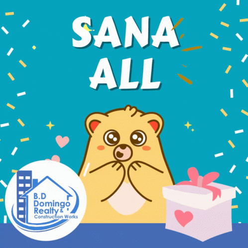 An animated ad for B.D. Domingo Realty featuring a cute bear, a gift box, and the phrase 'SANA ALL'.