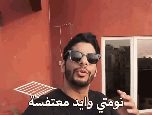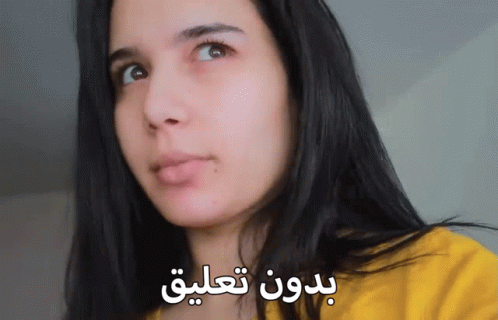 A woman looks off-camera, conveying a 'no comment' or 'speechless' expression, with Arabic text visible.