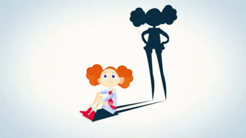 A cute cartoon girl with red hair transforms from sad to confident with the help of her supportive shadow.