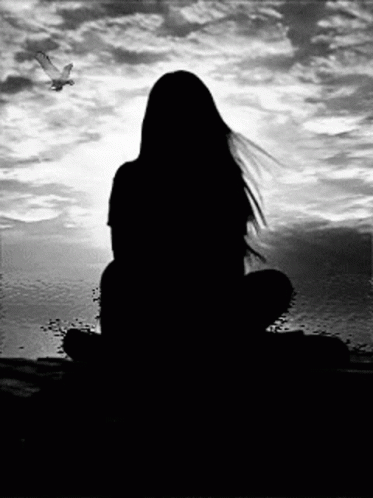 A serene silhouette of a woman sitting on a beach, gazing at the sky with birds flying overhead.