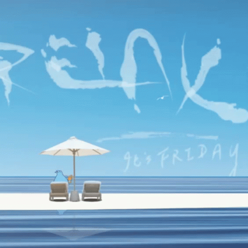 Angel the Mudskipper relaxes on a beach chair under an umbrella, with 'RELAX' in the clouds and 'it's FRIDAY' on the sand.