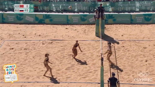 An intense moment in a beach volleyball match between Norway and Russia as a powerful spike is successfully blocked.