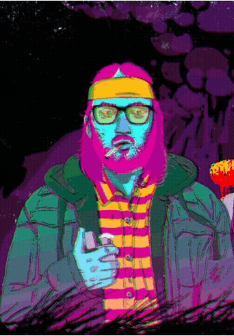 A colorful, pixelated drawing of a bearded man with glasses, smoking a cigarette in a Hotline Miami-inspired style.