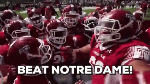 Temple University football players huddle on the field, motivated by the chant 'Beat Notre Dame!'