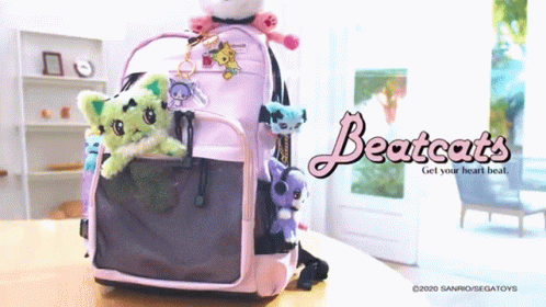 A cute pink backpack adorned with various Beatcats plushies and keychains, showcasing Sanrio merchandise.