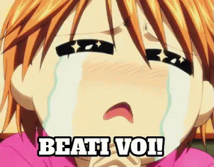 Anime character with orange hair crying tears of joy, with the Italian text 'Beati Voi!' (Lucky You!)