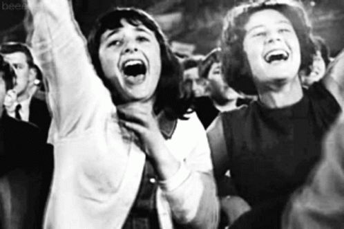 Two excited girls scream and cheer in a crowd during the height of Beatlemania.