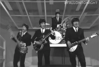 The Beatles perform live on stage in a classic black and white recording, playing their iconic instruments.
