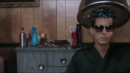 Mark Ronson, wearing sunglasses and blue hair curlers, sits under a hair dryer at a beauty parlor.