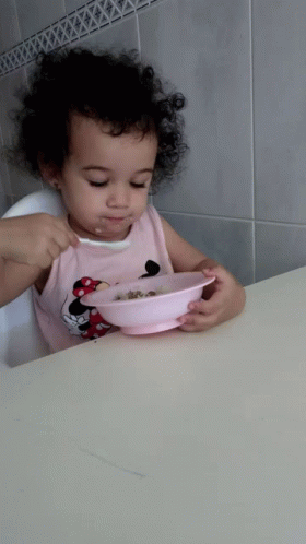 A cute baby with curly hair eats cereal from a pink bowl, wearing a Minnie Mouse shirt.