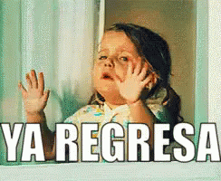 A little girl cries and bangs on a window, with the overlay text 'YA REGRESA' (Come Back Now).