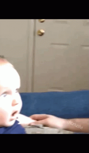A baby with wide, surprised eyes looks directly at the camera, held by a person with 'charlysim' on their wrist.