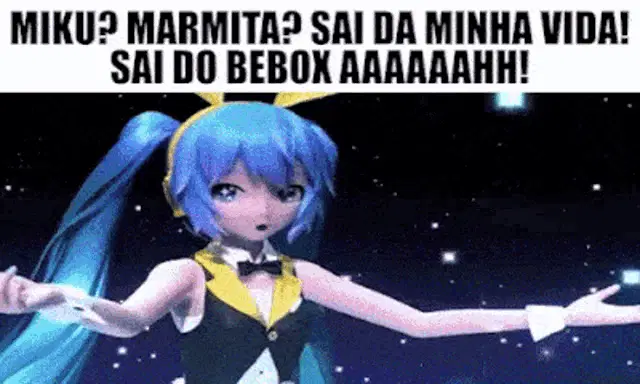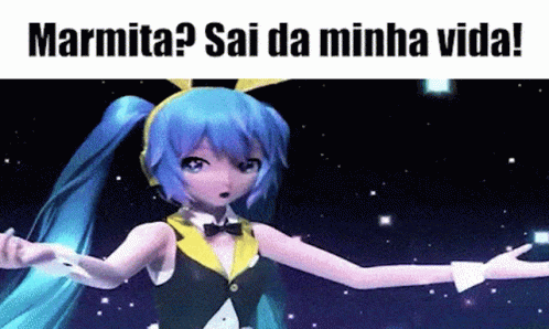 Animated character with blue hair dancing on a futuristic stage with the text 'Marmita? Sai da minha vida!'