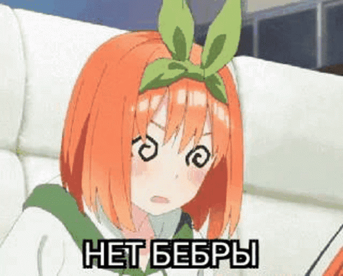 Anime girl Yotsuba Nakano with orange hair and green ribbon looks dizzy, expressing 'NO BEBRA'.