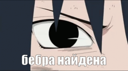 A close-up of Sasuke's Sharingan eye from Naruto, with the Russian text 'bebra found' appearing.