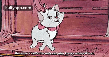A cute cartoon cat with a pink bow and the quote 'Because a cat's the only cat who knows where it's at.'