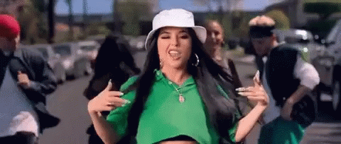 Becky G showing off her swag and dancing in a green crop top and white hat with friends on a street.