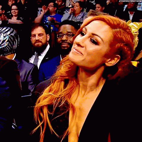 Becky Lynch, the WWE superstar, shrugs her shoulders with a quizzical expression while in the audience.