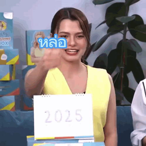 Becky Rebecca Armstrong winks and points, with the word 'handsome' and '2025' visible on a calendar.