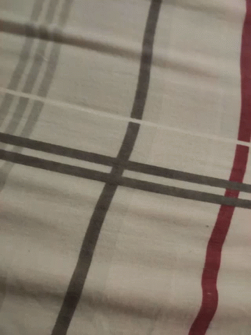 Close-up of a plaid bed sheet with red and gray stripes.