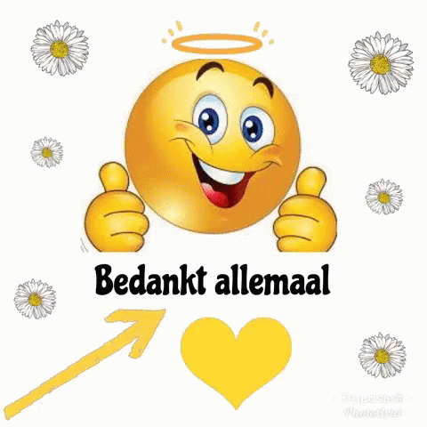 Smiling emoji with halo gives thumbs up, saying 'Bedankt allemaal' (Thanks everyone).
