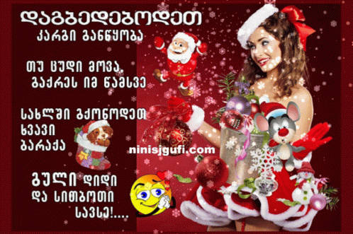 A festive Georgian New Year's greeting card featuring a woman dressed as Santa Claus, surrounded by holiday decorations.