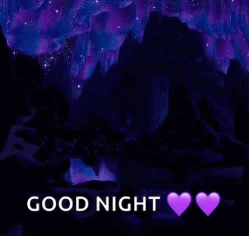 Aurora Borealis with 'GOOD NIGHT' text and purple hearts, perfect for bedtime wishes.