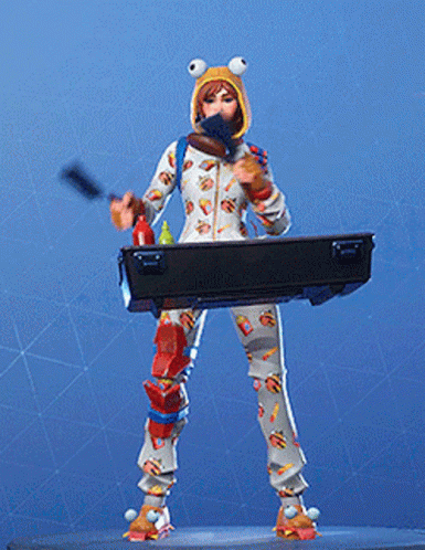 Fortnite character in a burger-themed outfit performs the 'Beef Time' emote, flipping a burger patty on a grill.