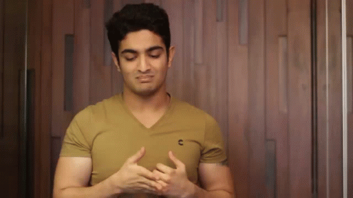 Ranveer Allahbadia (Beerbiceps) speaking and gesturing, wearing a light brown V-neck t-shirt.