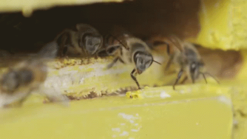 Bees busy at the entrance of their yellow hive, some appearing to leave or enter.